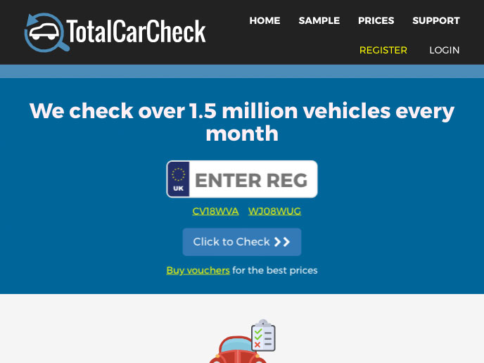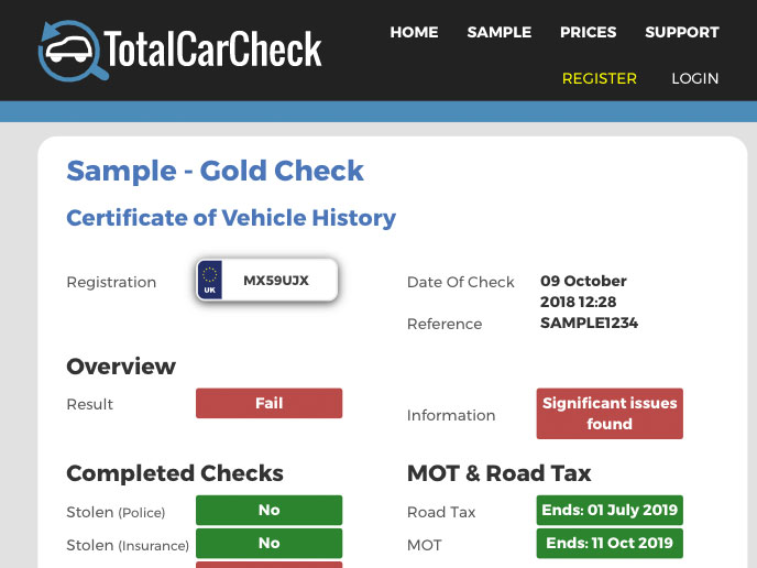 Check out the details for Total Car Check's car data report, including basic and advanced report levels where offered, and a screenshot of a sample report from Total Car Check.